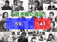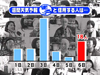 今週は、番組でおなじみの気象予報士が大集合! 街行く人100人に「お天気に関するアンケート」を実施。言いたい放題の意見を気象予報士の5人にぶつけました!まず、女子高生100人に天気予報でよく使われる言葉をどの程度知っているのかを調査しました! 質問(1):「西高東低」の意味を知ってますか? 正解 20人 正解は「日本から見て西に高気圧・東に低気圧がある冬型の気圧配置」 まず漢字の書き方を尋ねると「成功当定」、「正候倒帝」という答えも! 中には「太陽が西から上って東に下りる」という意味だと答える女子高生もいました。 質問(2):「霜注意報」の意味を知ってますか? 正解 7人 正解は「霜によって農作物に著しい被害が予想される場合にその旨を注意して行う予報」 中には霜という漢字を、「ハコ」と読んだり「キリ」と読む女子高生が多く 意味を聞いても、「ツララが落ちてくるから注意」や、「しもやけに注意!」という意見もありました。 質問(3):「冬日」の意味を知ってますか? 正解 9人 正解は「最低気温が0℃未満の日」 冬日(フユビ)を「カンニチ」、「コンニチ」と読む女子高生も。 夏だけど冬のように寒い日という意見もあるなど正答率の低い結果となりました。 天気用語を女子高生に伝えるのはなかなか難しいようですね! 街の老若男女100人にも天気予報についてのアンケートを実施。 質問:週間天気予報は何日先まで信じるか? 3日と答える人がなんと48人!平均すると3,4日先まで信じるという結果になりました。 質問:天気予報への要望 満足している59人/不満41人 不満だという人の意見の中には、「天気予報は、お笑い芸人やイケメンにやって欲しい」という意見も!やはり多かった要望は正確に予報して欲しいという意見。 やっぱり天気予報は当たってほしいですものね! 続いて、気象予報士の皆さんが本音を激白! 事前のアンケートを元にスタジオで本音を聞きだしました! Q、天気予報が当たって文句を言われたことがある A,5人 (森田、森、中塚、高森、與語) 雨や雪などの悪天候の予報が当たると、文句を言われることがあるそう。 森さんは「寒い!」と理不尽な文句を言われたこともあるそうです。 Q,他局の予報を見て自分の予報を変えたことがある A,2人 (森田、森) 人の予報も情報の1つとして活用し、強調点を変えて予報を出すことがあるそうです。 Q、天気予報がはずれて休みたいと思ったことがある A,3人 (中塚、高森、與語) 外した時は本当に辛い、という3人に対し、森田さん、森さんはなぜ外れたかを弁解出来る機会と考えているとのこと。 森田さんは予報を外して何度も苦情の電話を受けたそうで、その苦情も幾つかに分類されるそうです。 バカ野郎!と叫んで電話を切る「バカ野郎!一発型」、何度も同じ話を繰り返す「エンドレステープ型」 TBSの株主だと言われた「オモシロ脅迫型」 といろいろなパターンの苦情があったそうです。 Q、お天気ネタを真似たことがある A,4人 (森田、森、高森、與語) 真似され一人前と考える森田さん、しかし、高森さんは森田さんのネタを真似たことがあるそう。 高森さんは、アイデアを真似ただけで9割位は変えて使ったとのこと。 しかし、このお天気ネタの世界は「パクリまくりの世界」なんですって!! Q、分かっていながら外れる予報を出した A,5人 (森田、森、中塚、高森、與語) 特に災害に結びつくような時は、気象庁が出した悪い方の予報に合わせて予報を出すことがあるんですって! Q、天気予報をするのがキライだ A,2人 (森田、高森) 高森さんは、本当に自分の予報通りになるか心配で寝付けなくなるそうで、森田さんは天気予報のようなシビアな世界は、自分にはむいてないと思っているそう。これはちょっと意外な結果でした! |