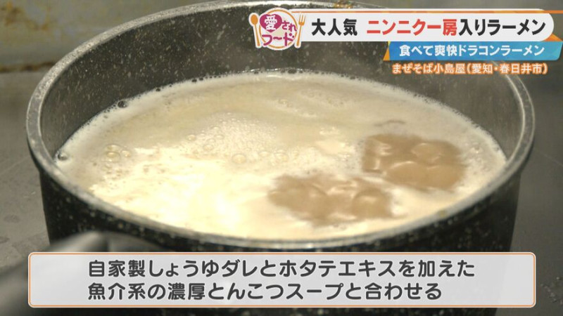 『ドラコンラーメン』とは、“どえりゃ~コンディションがよくなるラーメン”のこと。まずは大量のニンニク、豚こま肉、モヤシ、ニラなどを、オイスター風味の自家製ダレで手早く炒めます。さらにみじん切りの生ニンニクで香りづけ!そして、魚介系とんこつをベースに、ホタテエキスでうま味を倍増させたスペシャルスープと合わせれば完成です。