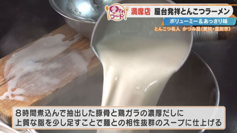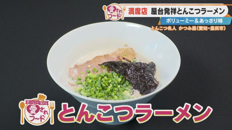 加藤愛アナウンサーがやってきたのは、愛知県豊田市の「とんこつ名人 かつみ屋」。この地で20年ほど続くとんこつラーメン専門店で、スープは“とんこつ”のみ!