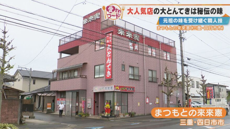 四日市市にある「まつもとの來來憲」は、ピンク色の建物が印象的な老舗中華料理店。名物「大とんてき定食」は、切り目の入った極厚豚ステーキが皿に盛られ、さわやかなソースとニンニクの香りが食欲をそそります。