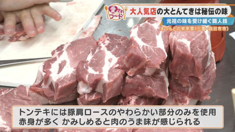 「まつもとの來來憲」の「大とんてき」が他と違うのは、その独特な形状。使用しているのは三重県産をメインとした国産の豚肩ロースで、脂身と赤身のバランスが良く、うま味が詰まった部位を選んでいます。