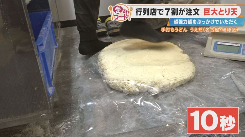ご主人によると、生地を折り返して片面を約8秒間踏む。それを3回繰り返すと、ちぎれを知らない超弾力麺ができるとのことです。実際に見せてもらうと、今回はなんと10秒でした!