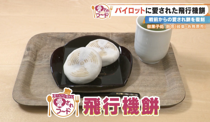こちらの名物が「飛行機餅」。プロペラみたいな焼き印がついた、なんとも可愛らしいお餅です。各務原航空自衛隊基地が、まだ飛行試験場だった100年前に、旧陸軍のパイロットや職員が飛行場で食べていたという大福餅。その兵隊さんたちから「飛行機餅」と呼ばれ愛された、銘菓の復刻版です。