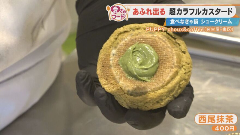 紅イモ、黒ゴマ、ストロベリー、マンゴーなど、色とりどりの自家製クッキーシューに、果汁や果肉を合わせた濃厚なカスタードを詰めた、15種類以上のシュークリームが楽しめます。加藤愛アナウンサーは、西尾の抹茶をふんだんに使った大人気の抹茶味をいただきました。
