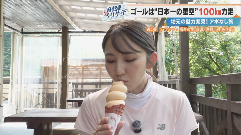 午前10時。友廣アナはレストランを目指して出発。きれいな新緑の中を自転車が進みます。下り坂が続き、「フィーバータイム」と喜ぶ友廣アナ。視界には上矢作町の大自然が広がります。
