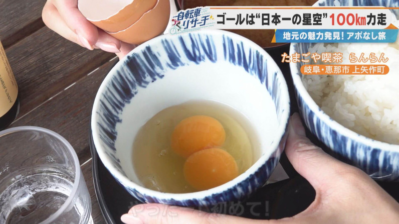 そんな最高の環境で育った鶏の卵で「卵かけご飯」をいただきます!友廣アナは卵を手に取り「大っきい!」「スーパーで見るLサイズより大きい!立派な卵だ!」と驚きます。卵を割ると、ツヤツヤの黄身が二つ入っていました。