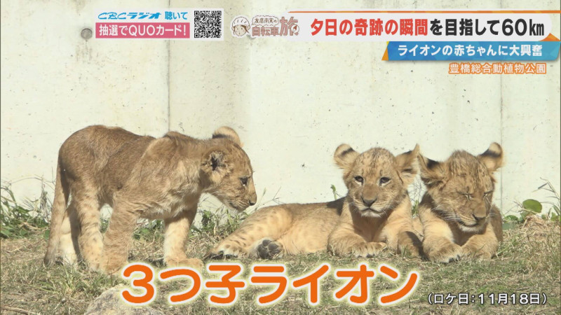 体長わずか60㎝、体重約10㎏の3つ子ライオンと対面。友廣アナは「えっ、小っちゃぁ~!寝てる、寝てる!かわいい~」と大興奮!「癒やされるぅ~。でも、お顔はしっかりライオンですね。立派な顔!整ってます」と3匹をリポートします。