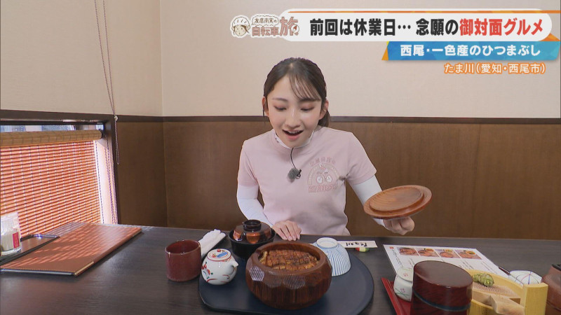 友廣アナは料理を前に深呼吸。「対面です…。ボリューム満点!おいしそうすぎる!我慢できない!」とご飯をよそいます。「ふわふわですよ!もう、よそっている時から、炭の香りと甘辛いタレの香りがします」と笑顔に。うなぎを頬張り、「めっちゃ、おいしい!ふっわふっわ!皮面はパリッとしていますけど、その奥のジューシーさ!そこに甘いタレが良く絡んでる!豊富な薬味で味変できるのも、ひつまぶしの魅力ですよね~」と絶賛です。