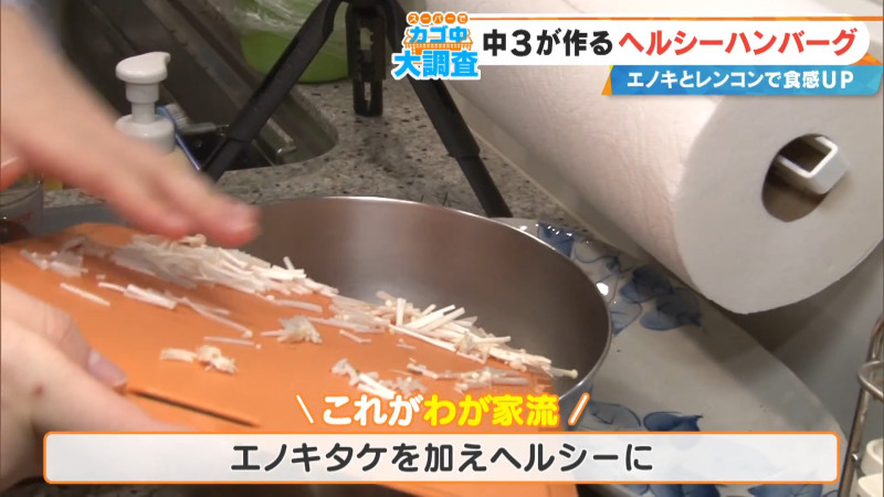 豆腐を入れたヘルシーハンバーグではなく、エノキタケを入れるバージョン。食感がとてもいいそうです。さらにレンコンチップスも作ると伺い、ご自宅へ。
