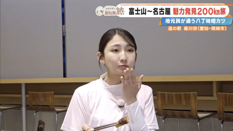 友廣アナは、八丁味噌を使った「竹千代ポーク味噌カツ定食」に舌鼓。「ん~濃厚!八丁味噌ならではの力強い旨味が一気に来ますね!カツもサックサクでジューシーです!」と笑顔に。