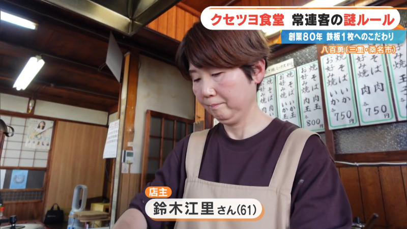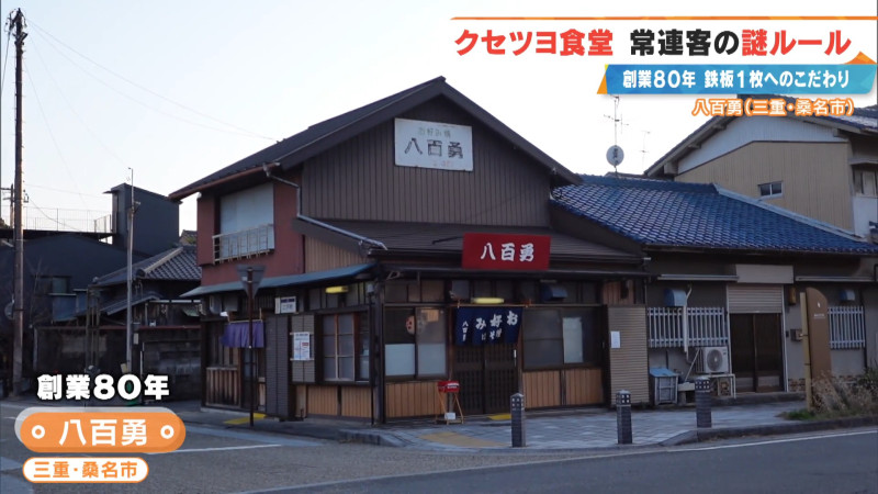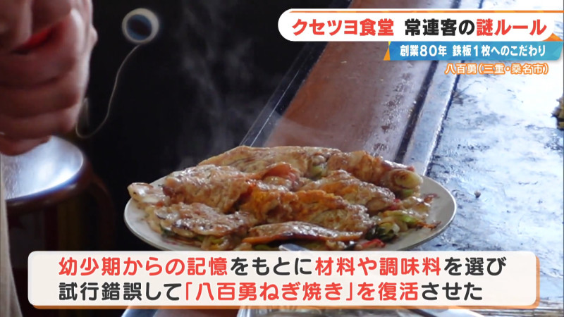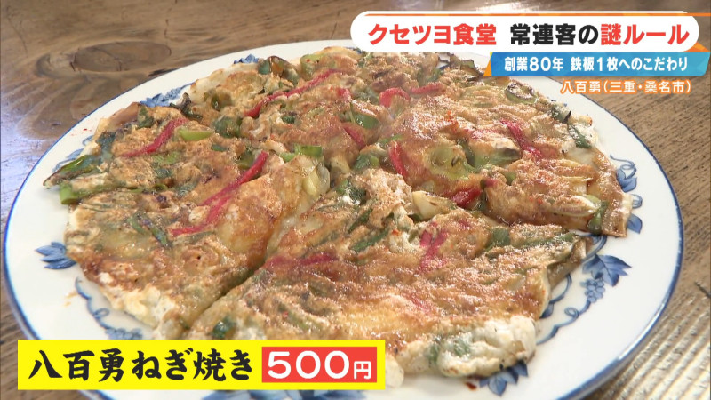 旧東海道の宿場町「桑名宿(くわなじゅく)」があった街道沿いにある、創業80年のクセツヨ食堂「八百勇」。創業以来、80年間不動の人気を誇る「八百勇ネギ焼き」は、客のほぼ全員が注文する看板メニューです。
