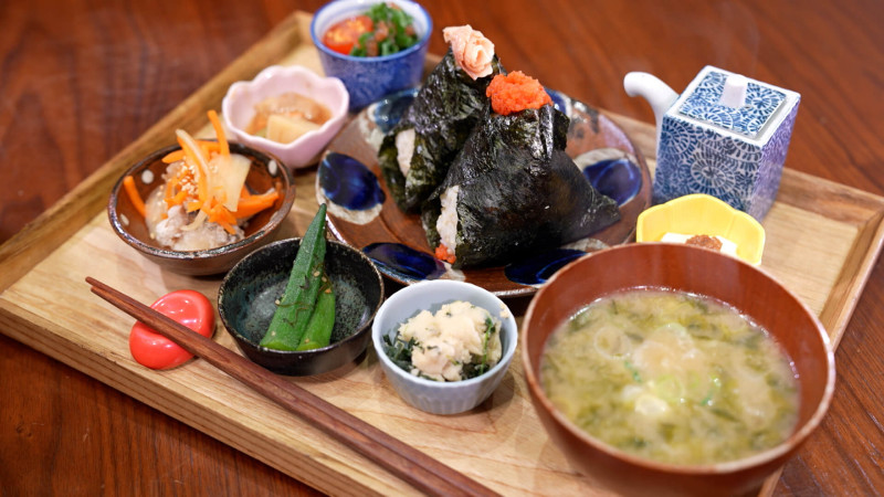 ポパイでは、おにぎりの定食も人気。「おにぎり一汁五菜定食」は、好きなおにぎり2個に、旬の食材を使ったおばんざい5種類、味噌汁、サラダが付いた朝(9~11時)限定の定食メニューです。