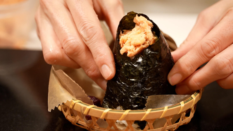 最大のふわふわポイントはご飯の握り方。具材を優しく閉じ込め、手にあら塩をつけて優しく3回握るだけ!梅村さんによると、「ほぼ握らず、整えている。のりで形を固める」とのこと。手でギューっと押し固めずに、優しく、形はのりでキープします。