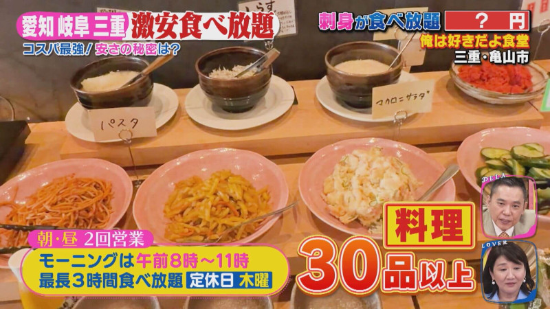 三重県からは、亀山インターから車で10分、三重・亀山市の「俺は好きだよ食堂」を紹介。朝と昼の2回営業し、モーニングは午前8時から11時。店内に置かれた30種類以上の料理が、営業時間内であれば最長3時間食べ放題です!