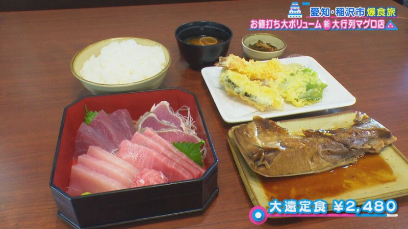 オススメは、「大遠(だいえん)定食」。本マグロの中トロやキハダマグロなど刺身が5種類に、マグロのカマの煮つけ、天ぷらも付いて2,480円と、豪華なのにリーズナブル!