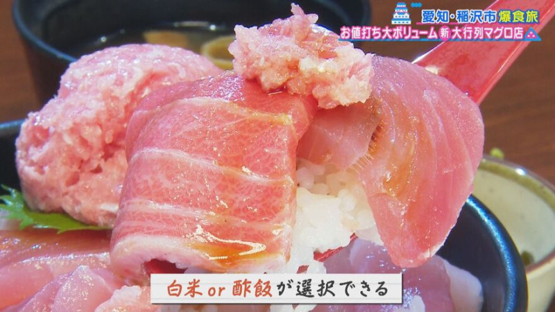 また、「まぐろ食べ比べ丼」(1,580円)もオススメ。ビンチョウマグロ、キハダマグロ、本マグロの中トロに自家製のたたきマグロがのっており、食べ応え抜群!ご飯は、白米または酢飯から選択できます。