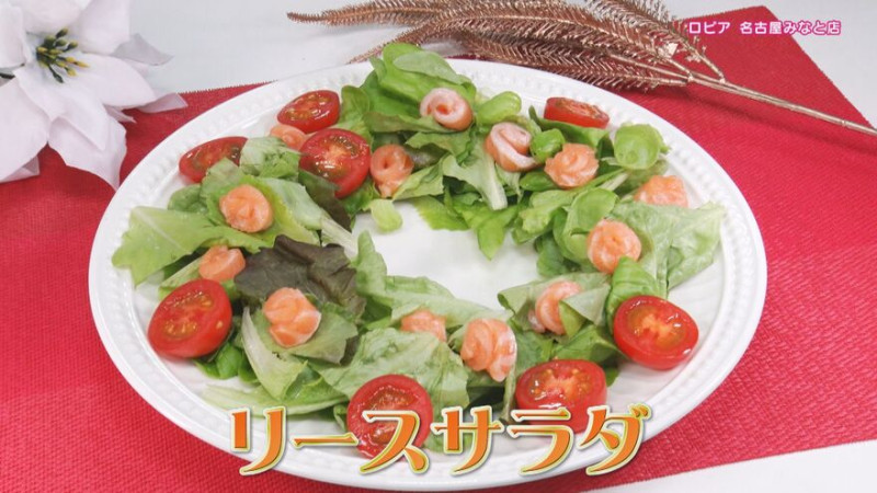 ノルウェー産の「生アトランティックサーモン」(100gあたり464円)は、一度も冷凍していない状態でお店に並ぶので鮮度抜群!食べやすい厚さにカットしたサーモンをくるくると巻き、レタスやミニトマトなどお好みの食材と一緒に飾り付ければ、クリスマスらしいリースサラダができます。