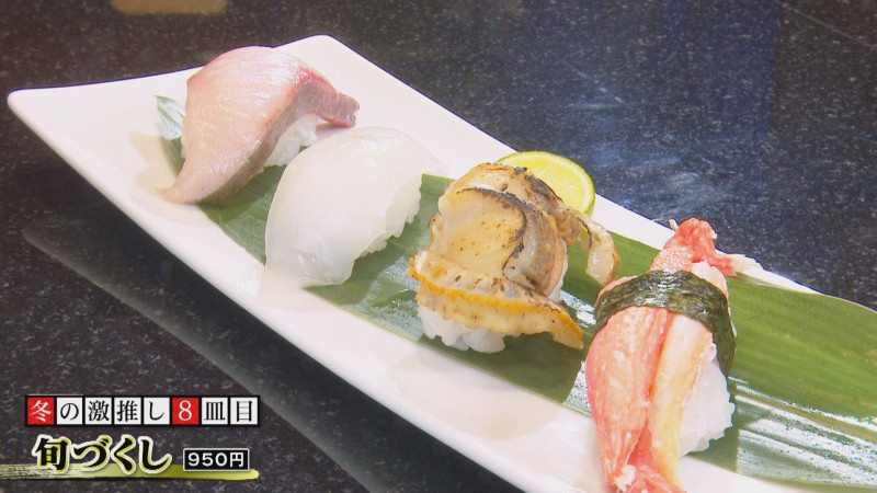 この冬食べるべき一皿は、厳選された4貫がセットになった「旬づくし」(950円)。冬の今は、紅ずわい蟹・蒸し帆立漬け焼き・あおりいかすだち塩・寒ぶりのラインナップ。すだち塩で食べるアオリイカは、甘みが引き立ち絶品です。