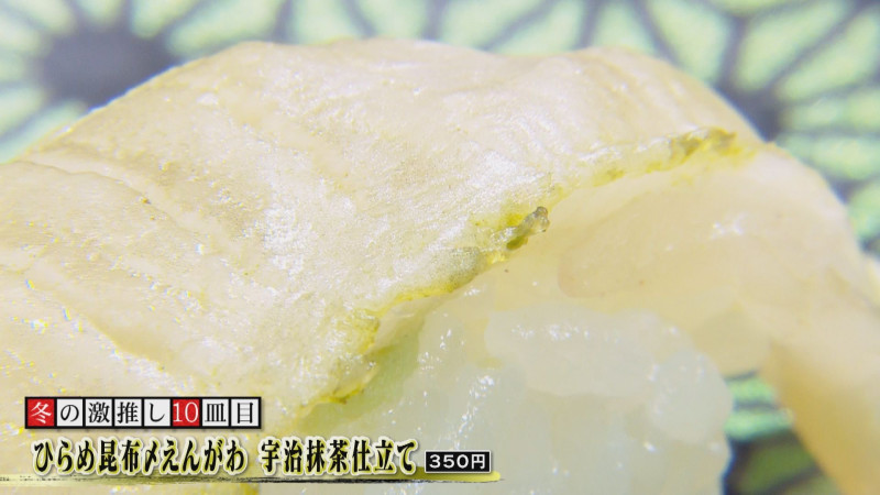 ほかに、「ひらめ昆布〆えんがわ 宇治抹茶仕立て」(350円)もオススメ。「昆布で締めることにより、水分が抜けて旨味が凝縮」と加藤さん。宇治抹茶仕立てになっており、ほのかに香る風味が食欲をそそる一皿です。