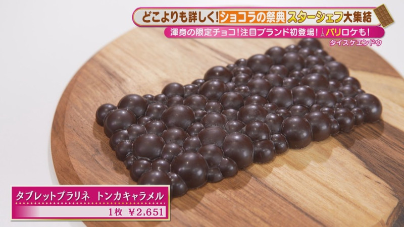 一躍有名にしたのが、通称“ポコタブ”と呼ばれるタブレット状のショコラ「タブレットプラリネ トンカキャラメル」(1枚 2,651円)。キャラメルを流す量がバラバラなため、食べる場所によって変わる食感がたまりません。フランスでは香水に使われるほど香りの良い“トンカ豆”を使うのも遠藤シェフならでは!