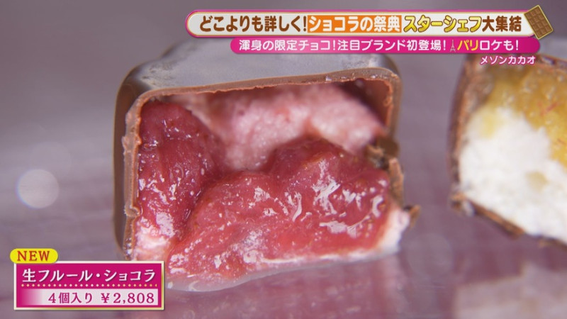 もう1つは、果実のみずみずしさと生クリームがあふれ出す「生フルール・ショコラ」(4個入り 2,808円)。素材にこだわったりんご、洋梨のル・レクチェ、パイナップル、あまおうのラインナップが味わえます。