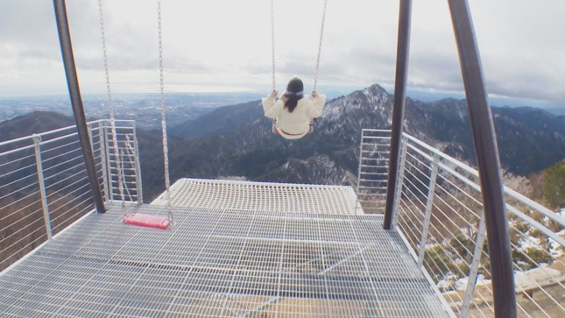 壮大な景色を眺めながら大自然の風を感じられる「ブランコ」(3分間 500円)は格別!テラスが10m突き出ているので、まるで空を飛んでいるような気分に。