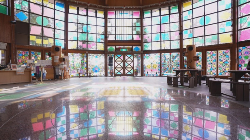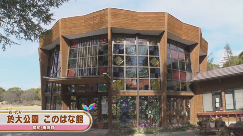 愛知県東浦町の「於大(おだい)公園」内にある「このはな館」は、2月15日まで壁面のガラスにステンドグラス風の装飾がされています。