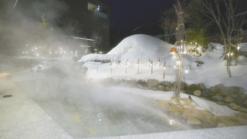 足湯の湯気と優しい明かりに包まれたかまくらは、まさに幻想的。宿泊者限定(1日5組)で使用することができます。※3月23日まで