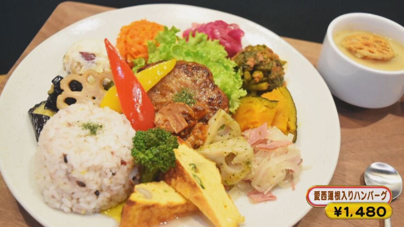 新設されたレストランもレンコン推し!テラス席もあるカフェレストラン「aicon(アイコン)」では、レンコンがたっぷり入った「愛西蓮根入りハンバーグ」(1,480円)に、レンコンと白あんを合わせた「蓮根『あん』あんぱん」(500円)など盛りだくさん。