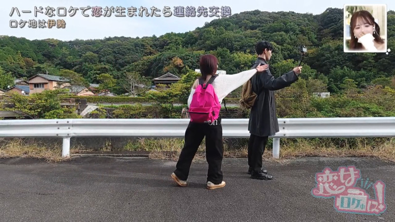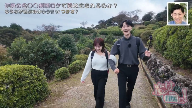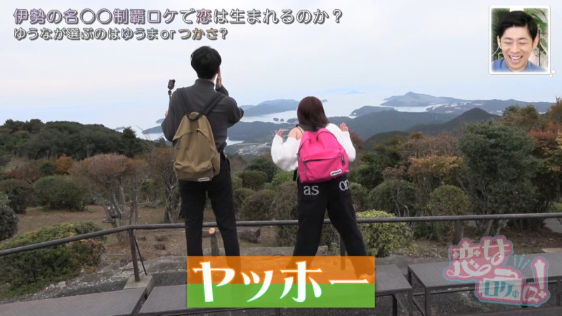 ゆうなはつかさの腕にそっと組みつき、2人は自然と“新郎新婦ごっご”に。絶景ポイントに到着しても、結婚式ネタは止まりません。