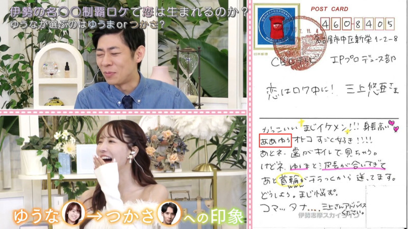 ロマンチックな提案をするゆうなに同意するつかさ。2人は今抱いている相手への印象をハガキに綴り、見えないようにしてポストへ投函しました。