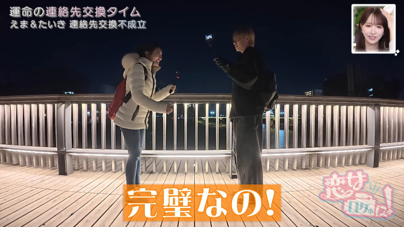 交際を前向きに考えている場合は、右手を差し出すルール。結果は…たいきは手を差し出しましたが、えまの手は動かず。連絡先交換は成立しませんでした。