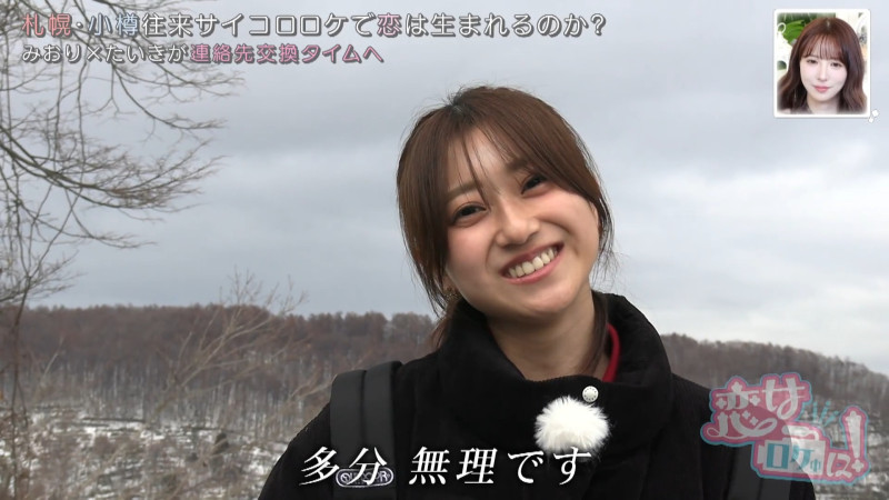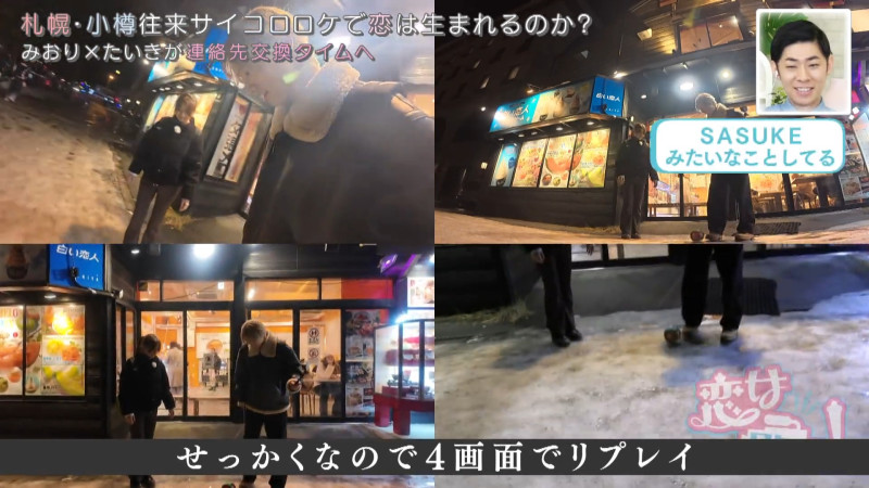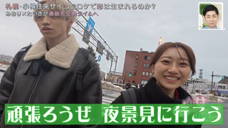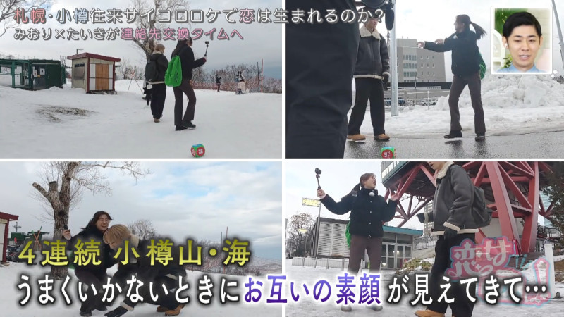 2巡目がスタート!「恋をしたい」と恋愛解禁で参加した元アイドル・大久保美織(27歳・以下、みおり)と、年下キャラの俳優・澤田大樹(23歳・以下、たいき)。2人は現在、「札幌・小樽往来サイコロロケ」に挑戦中です。