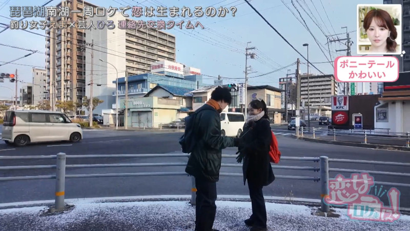 雪が降る中、10kmを歩いて浮御堂に到着。美しい景色の中で、“恋のお助けミッション”が発動します。