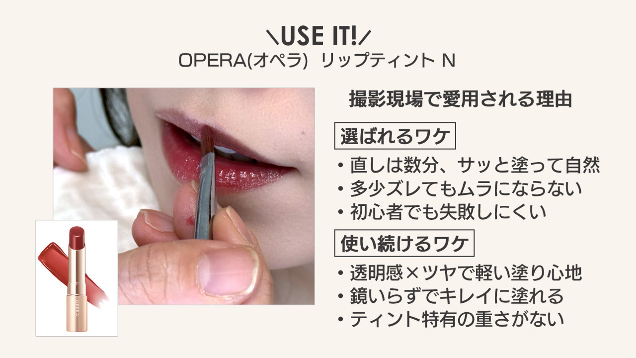 オペラのリップティント Nは、メイクのプロはもちろん、初心者でも扱いやすいティントとして、現場で高く評価されているそうです。