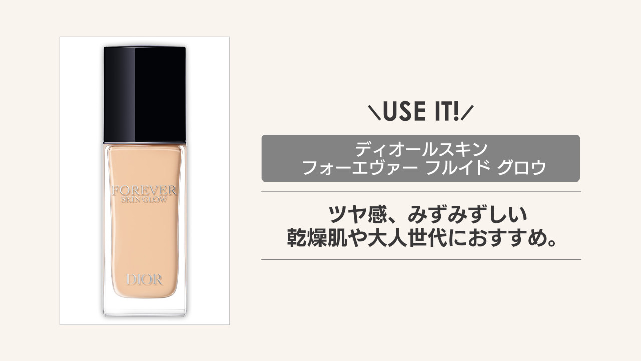 潤いが足りない肌質には、美容成分がたっぷり配合されたグロウをセレクト。グロウはツルンとしたみずみずしさを演出できるので、乾燥肌層に使うことが多いです。