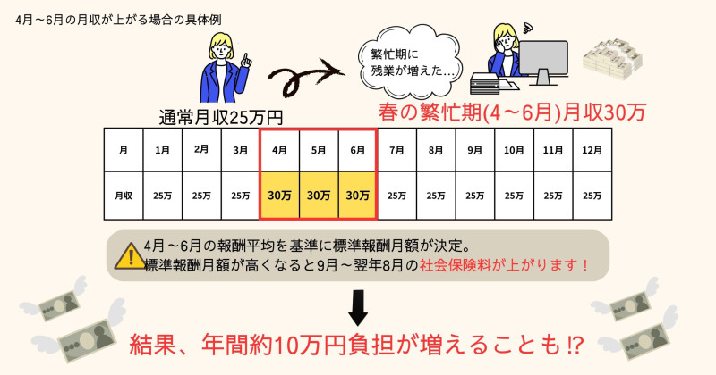 春に残業が多いと3カ月分の平均が上がり、標準報酬月額の等級が上がる可能性があります。