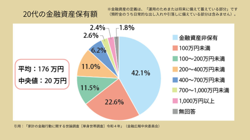 祖父江さん(FP):「はい。調査対象にはアルバイト生活をしている学生も含まれていますし、逆に、飛びぬけて金融資産を持っている人も含まれるため、平均値は引き上げられがちです。実態に近いとされる中央値でみると、約20万円になります。多くの20代は、金融資産が100万未満だと考えられます。」