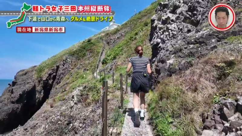 灯台の足もとにある展望台に辿り着くと、雄大な日本海の水平線が一望できる絶景が広がり、感激する三田。