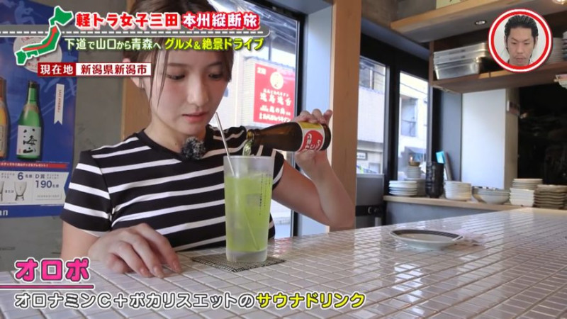 サウナでスッキリしたあとは、食事タイム。いつもはラーメンを食べる三田ですが、オロナミンCとポカリスエットを混ぜ合わせたサウナドリンク「オロポ」をいただくことに。