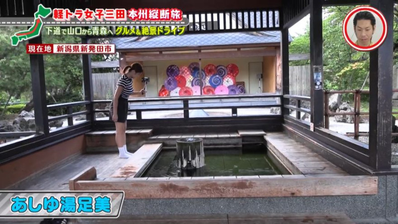 田んぼ道のドライブを楽しみ、しばらくすると新発田市(しばたし)に突入!軽トラを停めて月岡温泉街を散策すると、「足湯、発見!」。誰でも無料で利用することができる「あしゆ湯足美(ゆたび)」でリフレッシュすることに。