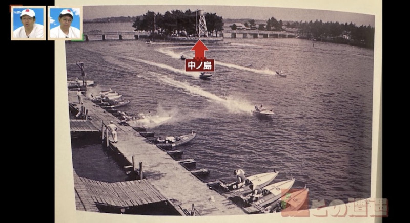 地元の方が見せてくれた昭和中期の中ノ島の写真には、改修される前の橋や、水道施設と思われるタンクが写っていました。手前にはボートレースのボートが写っており、昔は中ノ島の手前でターンしていたそうです。