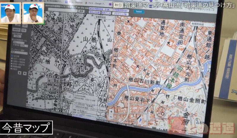 最初に訪れたのは、地域の資料が豊富な秋田市立中央図書館。秋田市をメインに、暗渠の情報を収集します。中でも欠かせないのが、インターネット上で明治期以降の古地図と現代の地図を比較できるサイト「今昔マップ」。年代ごとに川の有無を確認できるため、とても重宝しているそう。すると…