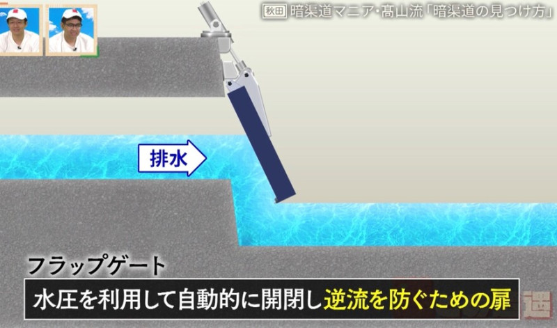 さっそく2人は、秋田駅の西側を流れる旭川沿いへ。すると、水圧を利用して自動的に開閉する扉“フラップゲート”を発見!今は雨水管になっている四十間堀の名残で、たびたび増水する旭川の水が逆流するのを防止するために設置されているそう。