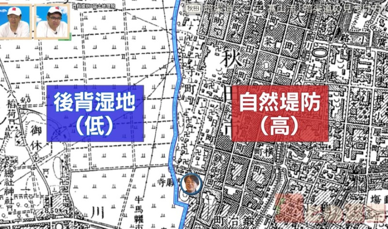 「ここは、寺町の境目の水路跡。水路を挟んで、東は“自然堤防”、西は“後背湿地”だった」