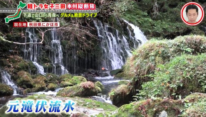 三田は、「景色のいい場所があるみたいだから、ちょっと寄ってみようっと」と観光を楽しむことに。立ち寄ったのは、にかほ市にある「元滝伏流水(もとたきふくりゅうすい)」。車を停め、川沿いを歩いていくと…
