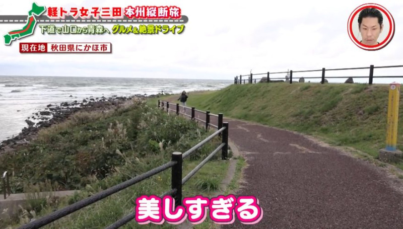 「元滝伏流水」をあとにした三田は、「秋田のおいしい名物いっぱい食べよっと」と、休憩することに。にかほ市にある東北最大級の道の駅象潟(きさかた)「ねむの丘」に立ち寄ります。