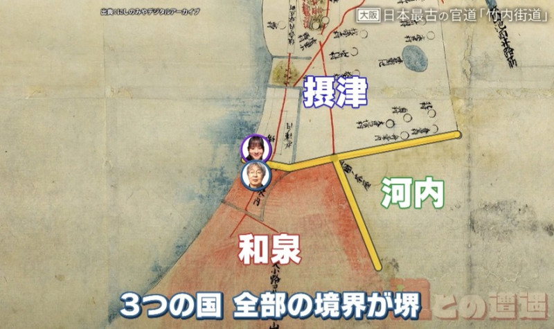また、「竹内街道より北が摂津の国、南が和泉の国。もう少し東に進むと河内(かわち)の国の境界もあるので、3つの国の境界があった。地名の『堺』は“境目”からきた名前」と言います。