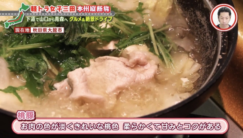 霜降りと表現したかったのか、思いのまま食リポする三田。きれいな桃色をしている秋田のブランド豚「桃豚」は柔らかく、「スライスの大根でロールサンドにすると、喉とおしがすごく良くてチュルルルって入ってきます」と独特な感想を述べます。
