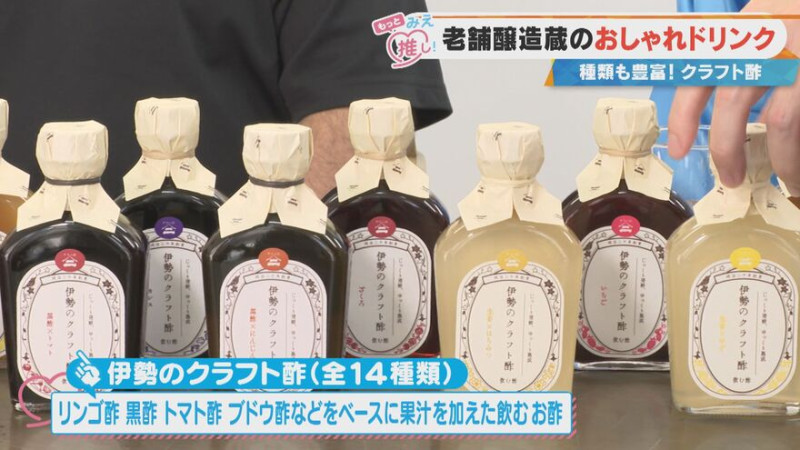 よしお兄さんが飲んだドリンクは、リンゴを発酵して作ったリンゴ酢をベースに、ショウガとゆずを加えたもの。「伊勢のクラフト酢」は、他にも黒酢・トマト酢・ブドウ酢をベースに作られていて全14種類を展開しており、どれも口当たりがまろやかでやさしい味が特長です。